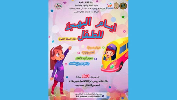 تم بهذه المناسبة، تقديم عرض بهلواني وحفل فني بالمجمع الثقافي "فسديس" لفرقة حسام سباع، وبراعم الإبداع للأستاذ مسعودان باديس، وينتظر أن تقدم الجمعية الثقافية "بلقيس" عين التوتة، غدا، عرض "رحلة جاسمين ". وسيتم في اليوم الموالي، عرض" قلعة المهرجين" لجمعية "سميراميس للثقافة والفنون" باتنة. كما خصص اليوم الثالث للساحر عمر وليد، من الجمعية الثقافية "جيل الأمل" لمدينة قايس، ولاية خنشلة، ليقدم عرضه الفني. سيتم أيضا خلال هذه الفعاليات التي تنظم في العطلة الشتوية، تقديم مسرحية "ذي بيق كيدس شاو" للتعاونية الثقافية "اللمسة" باتنة، ومسرحية "ذات الأوراق" لجمعية "البسمة الثقافية" سكيكدة .أما ولاية البويرة، فستقدم عرض "زهرة الحياة " للجمعية الولائية الثقافية أولاد البلاد.