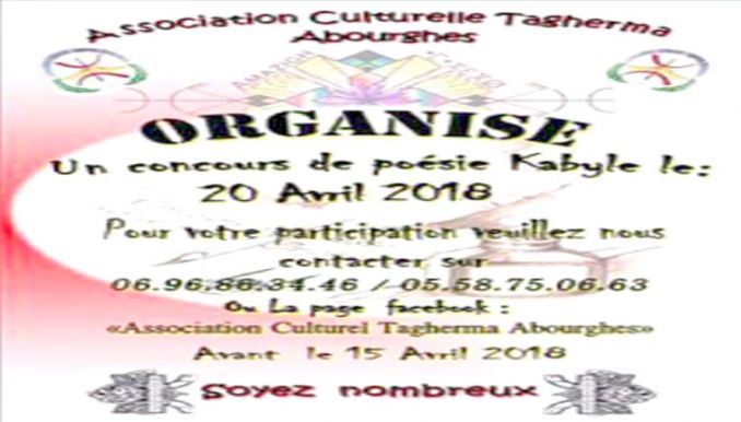تستعد قرية أبورغس ببلدية إيلولة أومالو الواقعة شرق ولاية تيزي وزو، لاحتضان مسابقة الشعر القبائلي في طبعته الأولى والتي تنظمها الجمعية الثقافية "تغارما أبورغس". ويُنتظر أن تعرف هذه التظاهرة التي سيعلن عن نتائجها في 20 أفريل الجاري، مشاركة قوية من عاشقي الشعر.